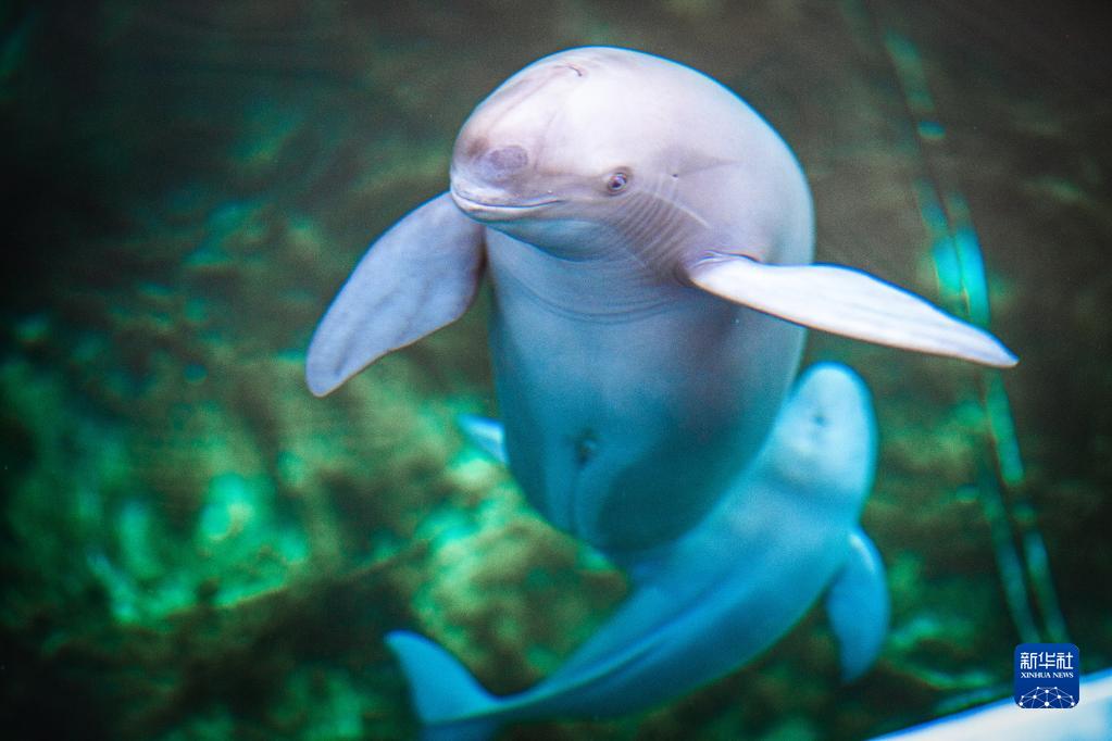 2022年6月29日,江豚媽媽“福久”和小江豚“F9C22”在中國科學院水生生物研究所白鱀豚館游動。在科研人員的監護下,“福久”于6月27日21時35分左右順利分娩,幼豚編號為“F9C22”,這是人工繁養長江江豚取得的新成果。