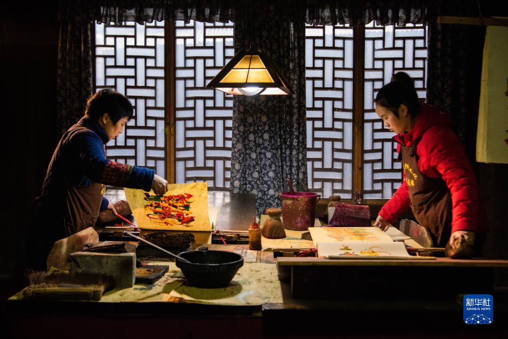2022年1月21日,在湖南省邵陽市隆回縣灘頭鎮一家年畫作坊,年畫藝人尹冬香(左)和女兒肖揚在印制年畫。