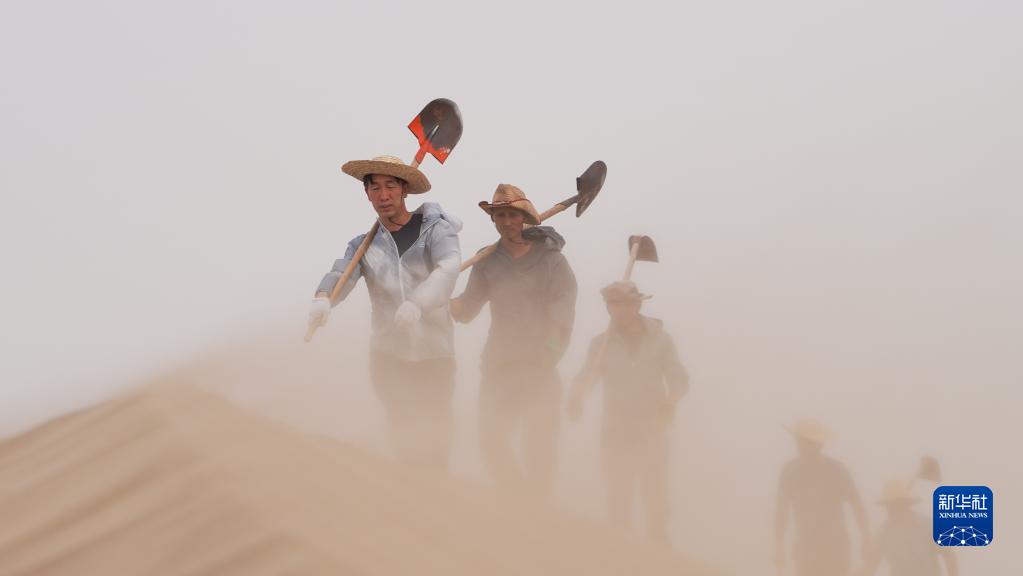 2022年7月3日,在新疆且末縣,張選忠(左一)、田野(左二)等老兵在塔克拉瑪干沙漠里頂風前行,對下一步計劃種植區進行地形勘查。