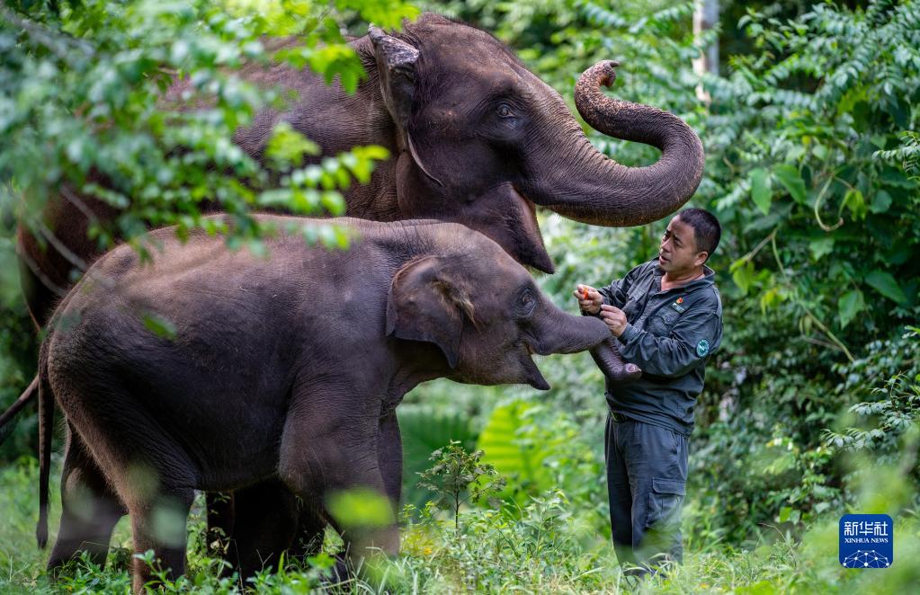 2022年7月28日,云南西雙版納野象谷大象醫生保明偉帶著大象進行野化訓練。