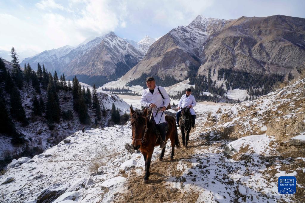 2022年1月25日,在新疆昭蘇縣的冬季牧場阿合牙孜溝,牧業醫院的醫生騎馬巡診。