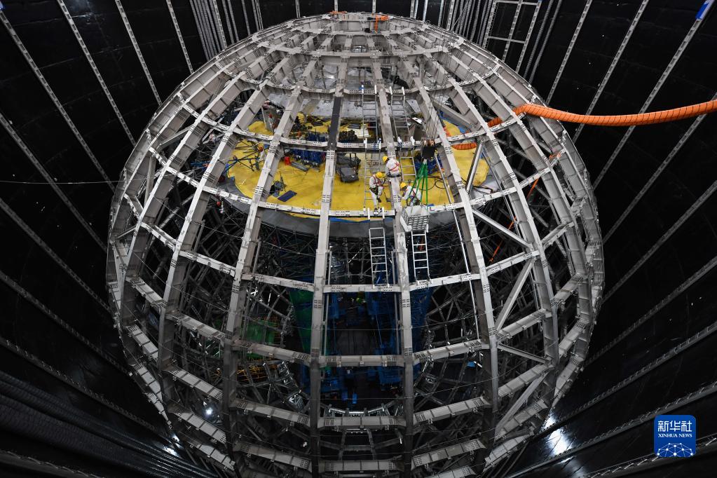 這是2022年9月2日拍攝的位于地下700米的江門中微子實驗探測器,呈現出巨大的球形結構。
