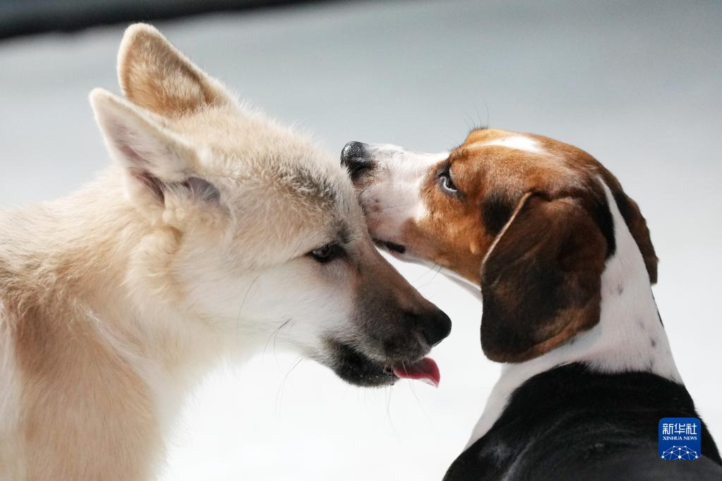 2022年9月26日,在哈爾濱極地公園內,克隆北極狼(左)和它的代孕母體比格犬在一起。這只克隆北極狼的供體細胞來自于哈爾濱極地公園2006年引進的北極狼“瑪雅”的皮膚樣本,代孕母體為一只比格犬。