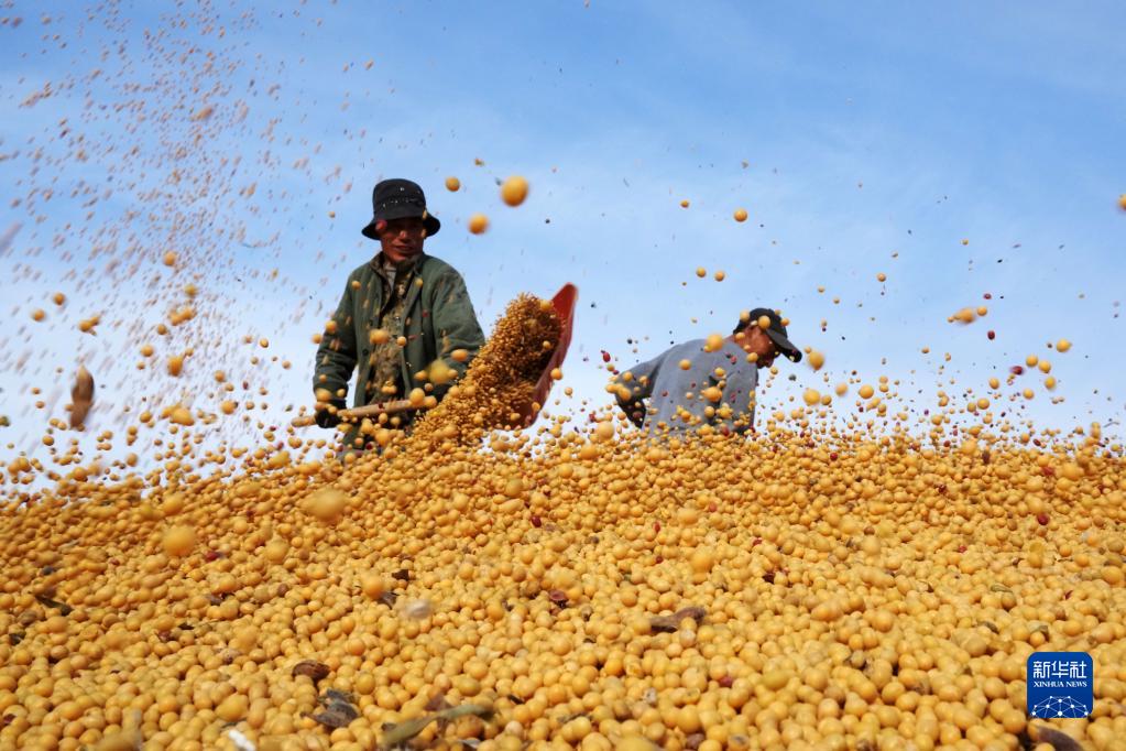 2022年10月20日,在北大荒農墾集團有限公司北安分公司趙光農場有限公司,工作人員在一處曬場的大豆堆上忙碌。