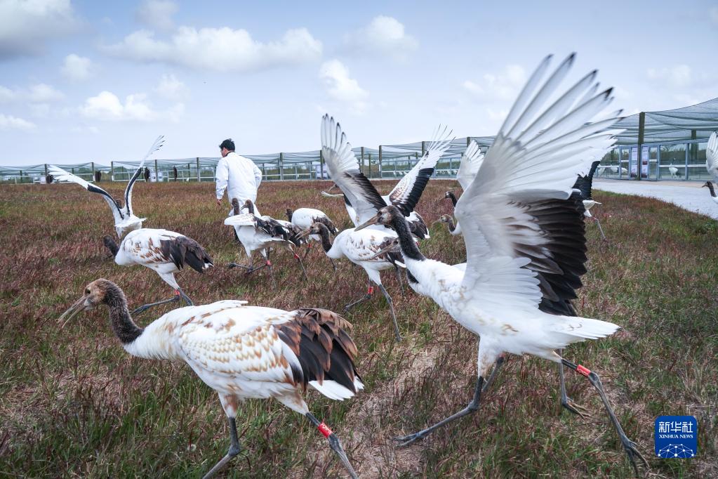 2022年11月8日,江蘇鹽城濕地珍禽國家級自然保護區馴養員姜官宏對人工繁育的丹頂鶴進行野化放飛訓練。