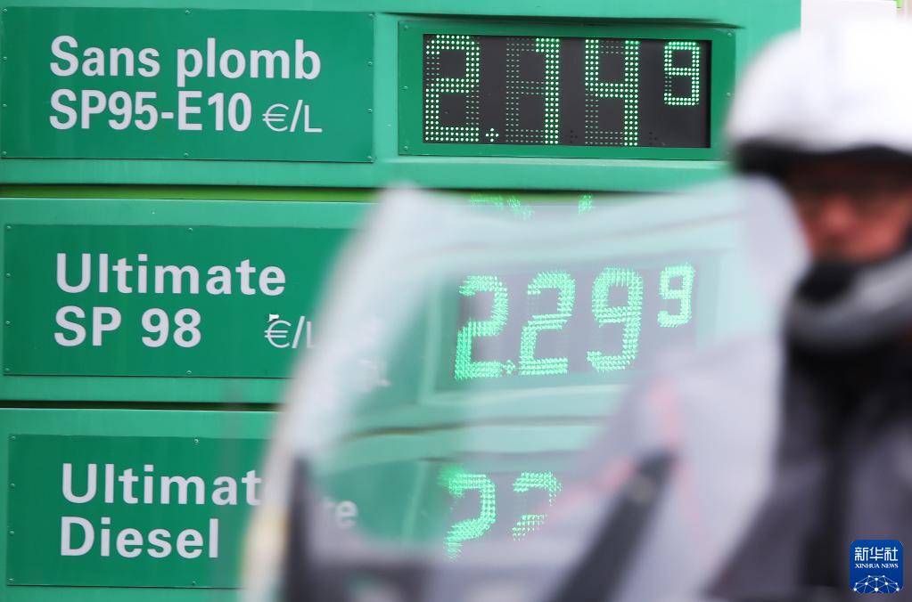 2022年3月16日,一名男子騎摩托車經過法國巴黎一處加油站。法國燃油價格持續上漲,柴油和汽油平均價格都已超過每升2歐元的門檻。