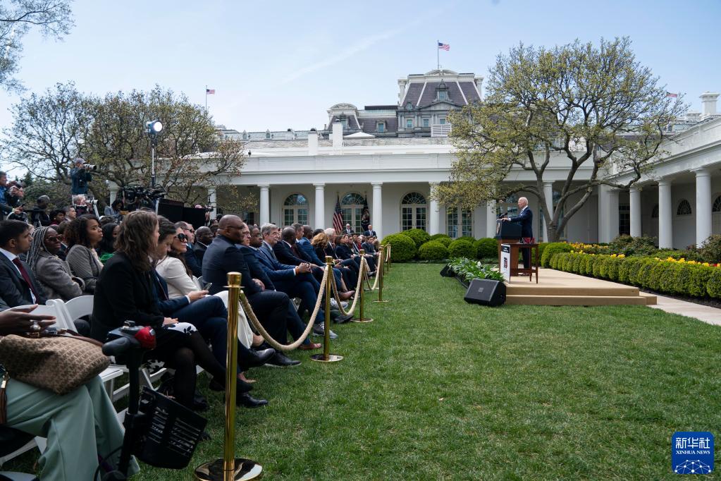 2022年4月11日,美國總統拜登(右一)在華盛頓白宮就監管“幽靈槍”的新規發表講話。美國聯邦政府當日出臺新規,著眼監管無編號且難以追蹤的“幽靈槍”。2022年,美國有近4.4萬人死于槍支暴力。