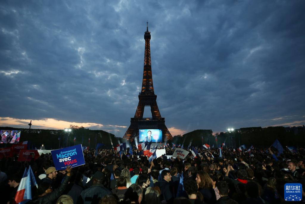 2022年4月24日,在法國巴黎,人們參加法國總統馬克龍的慶祝集會。馬克龍在當天舉行的法國總統選舉第二輪投票中獲勝,成為20年來首位勝選連任的法國總統。