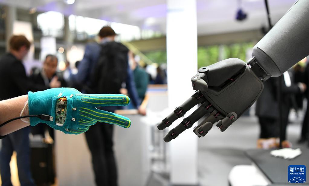 2022年5月30日,在德國漢諾威工業博覽會上,一款可感知人類手勢的智能機器人(右)與觀眾互動。受新冠疫情影響中斷兩年線下活動后,漢諾威工業博覽會2022年恢復線下舉行。