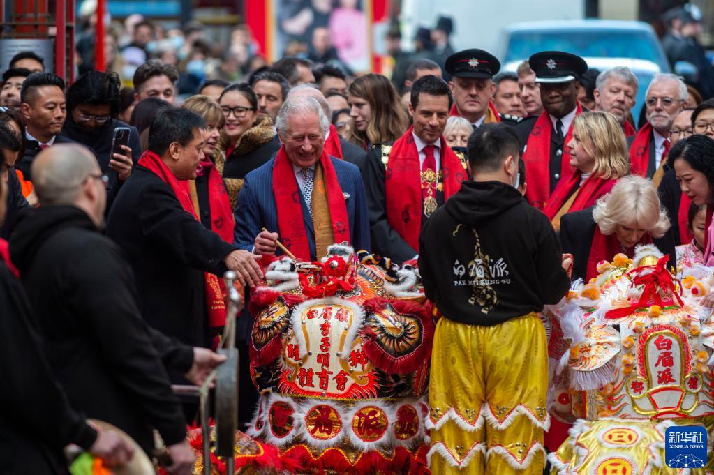 2022年2月1日,英國王儲查爾斯(中間藍衣者)與夫人卡米拉(前排右二)在倫敦中國城與當地華僑華人共慶中國農歷虎年春節。
