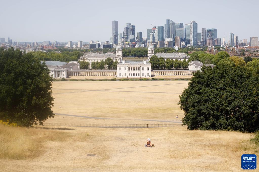 2022年7月18日,一名男子坐在英國倫敦格林尼治公園內枯黃的草地上。歐盟委員會聯合研究中心當日發布報告說,歐盟和英國總計近一半的領土正面臨干旱風險。