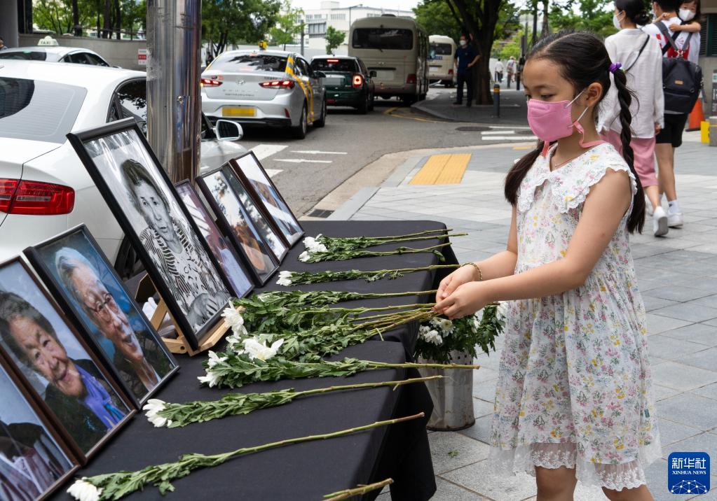 2022年8月14日,一名兒童在韓國首爾舉行的日軍“慰安婦”受害者紀念日活動上獻花。當日是世界“慰安婦”紀念日。