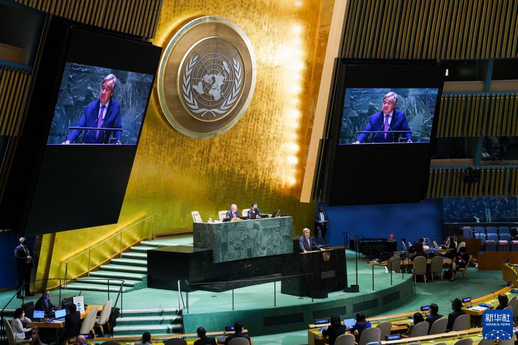 2022年9月13日,在位于紐約的聯合國總部,聯合國秘書長古特雷斯在第77屆聯合國大會第一次全會上致辭。第77屆聯合國大會當天開幕。這是新冠疫情暴發以來,聯大首次舉行全面回歸線下的會議。