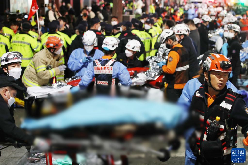 2022年10月30日凌晨,救護人員在韓國首爾市梨泰院洞一帶的踩踏事故現場工作。10月29日晚,首爾梨泰院洞一帶發生嚴重踩踏,致使158人遇難、逾190人受傷。
