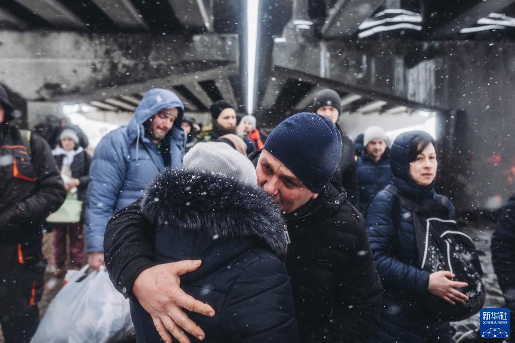 2022年3月8日,一對情侶在烏克蘭伊爾平告別。俄羅斯3月9日啟動“安靜模式”,在烏克蘭首都基輔等幾座大城市開通人道主義走廊,供平民撤離。