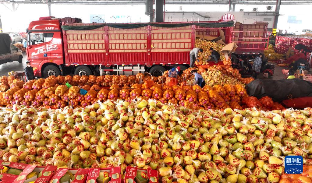 春節臨近,廣西柳州市各水果批發市場里一派繁忙景象,隨處可見工人裝卸水果的忙碌身影,商家籌備貨源,滿足節日市場供應。