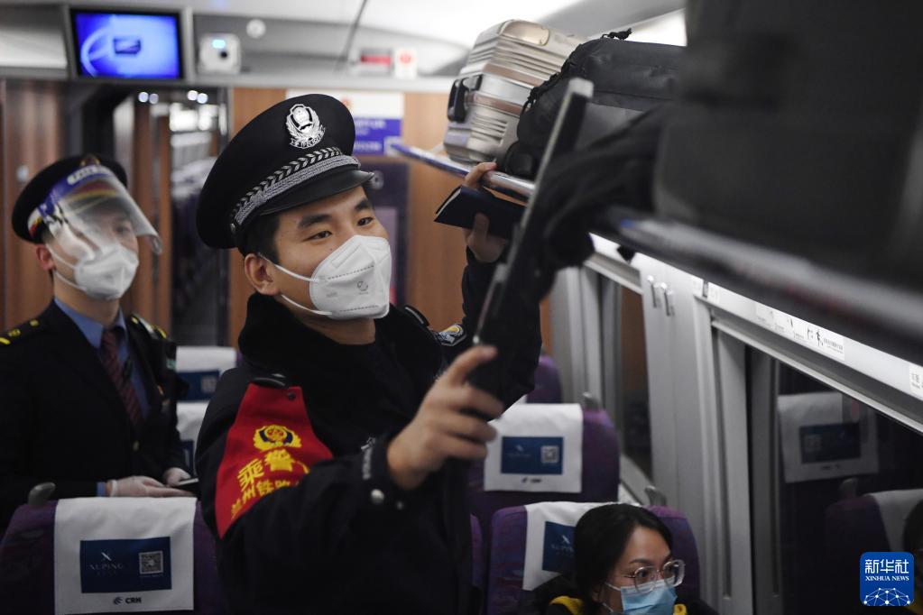 1月9日,白旭偉在G2686次動車組列車上對旅客行李進行安全檢查。