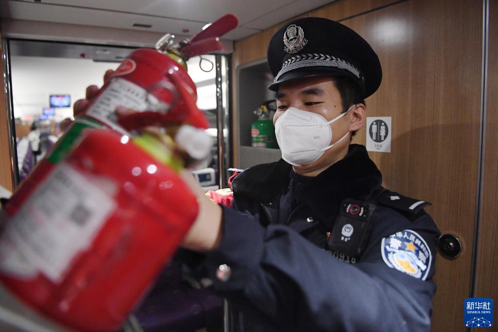 1月9日,白旭偉在G2686次動車組列車上檢查消防器材。