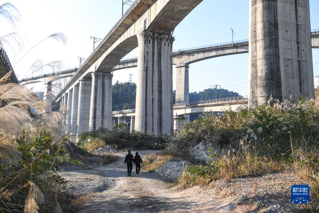 1月8日,鐵路警察王云(右)和謝源在鐵路沿線進行線路安全巡查。