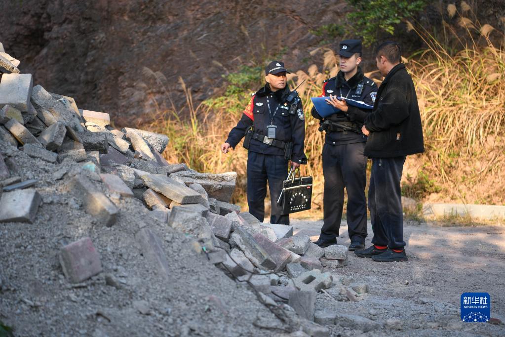1月8日,鐵路警察王云(左)和謝源(中)對堆放建筑廢料影響鐵路橋墩穩定的村民進行勸導。