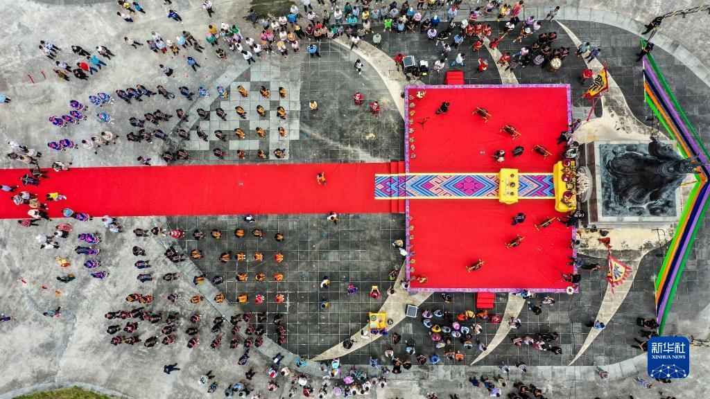 2022年6月24日,廣西大化瑤族自治縣瑤族群眾在祭祀布努瑤始祖“密洛陀”(無人機照片)。