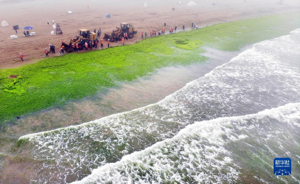 2022年7月3日,環衛工作人員在山東省青島市嶗山區石老人海水浴場海灘上清理滸苔(無人機照片)。