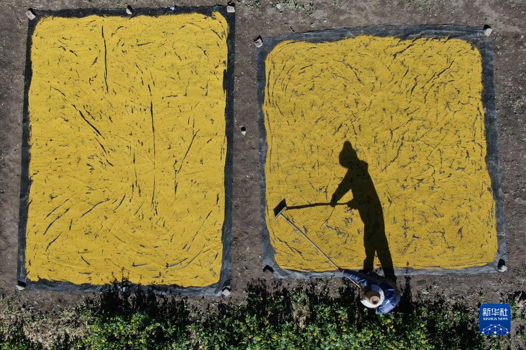 2022年7月3日,在青海省海北藏族自治州門源回族自治縣,來自四川德陽的蜂農馮躍宣在晾曬花粉(無人機照片)。