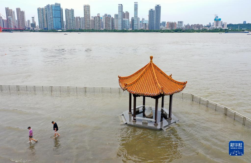 2022年6月11日,兩名市民離開湖北武漢武昌區江灘黃花磯涼亭(無人機照片)。長江武漢段水位多日持續上漲,逼近武漢長江防汛25米設防水位。