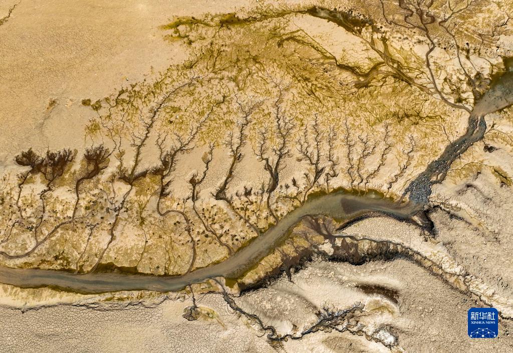 隨著黃河小浪底水利樞紐汛前調水調沙的結束,黃河小浪底庫區水位下降,大面積河床裸露出水面,河水在河床上沖刷留下的痕跡形成黃河“沙畫”。