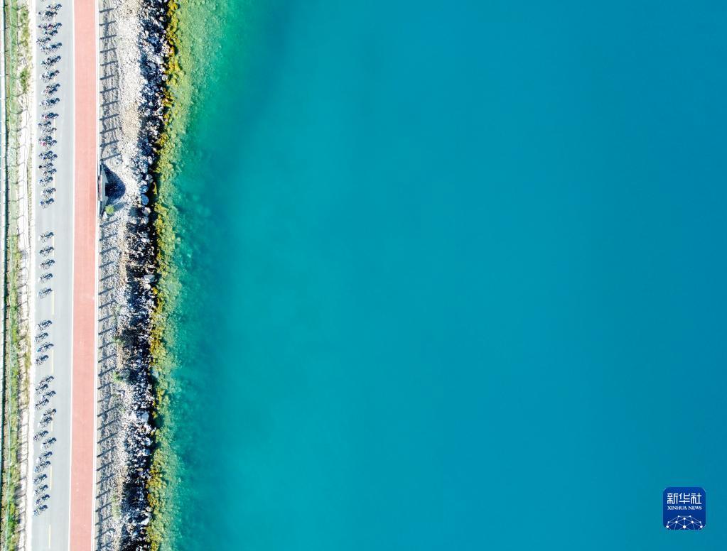 2022年7月26日,參賽選手在比賽中(無人機拍攝)。當日,中國新疆第14屆環賽里木湖公路自行車賽落下帷幕。
