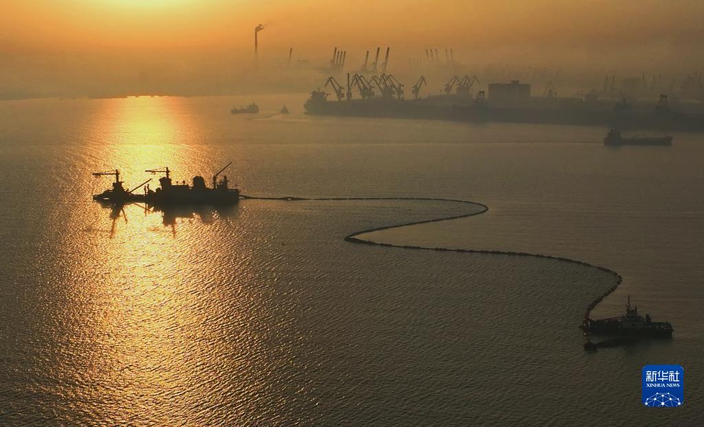 2022年10月8日,施工船在河北省唐山港京唐港區第四港池25萬噸級航道工程建設工地施工(無人機照片)。