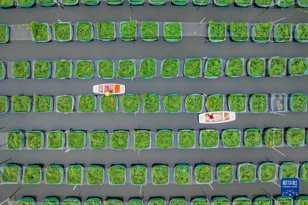 2022年11月12日,湖北省孝感市云夢縣開發區和平村村民在池塘中喂養黃鱔(無人機照片)。