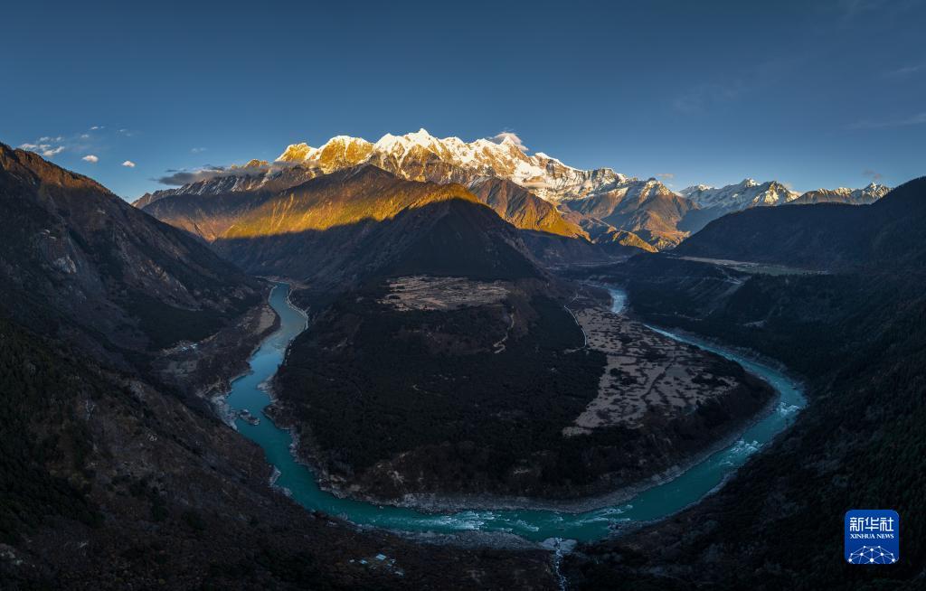 這是2022年11月28日拍攝的流淌在南迦巴瓦峰腳下的雅魯藏布江(無人機合成照片)。