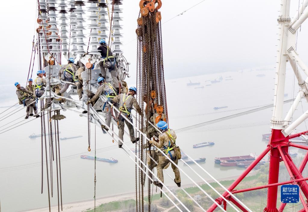 2022年3月13日,在安徽蕪湖的長江邊,安徽送變電工程有限公司施工人員在高空進行特高壓輸電線路跨江作業(無人機照片)。3月14日,白鶴灘—江蘇±800千伏特高壓直流輸電工程安徽段跨越長江放線工程完成最后6根導線的展放,標志著特高壓“白江線”安徽段長江大跨越線路貫通。