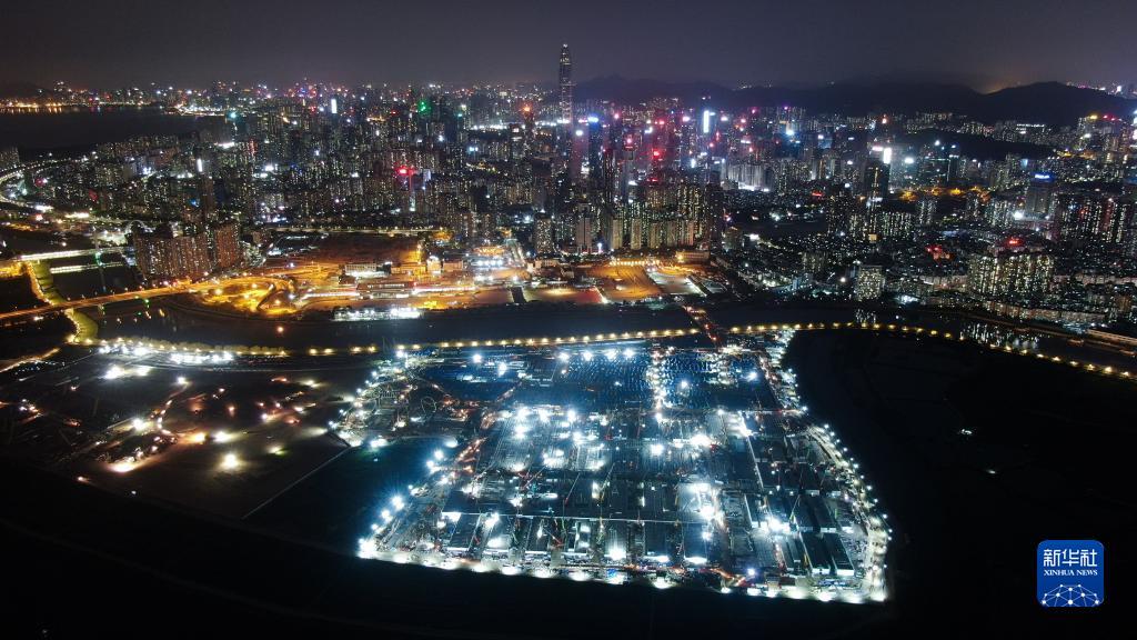 2022年3月17日,中央援港應急醫院建設工地燈火通明(無人機照片)。2022年4月7日,位于香港落馬洲河套地區的中央援港應急醫院項目一期工程按期完工并通過驗收。兩萬余名來自五湖四海的建設者發揚“同胞有難、義不容辭”的精神逆行出征,經過30天爭分奪秒日夜奮戰,在一片荒灘上建起“生命之舟”。