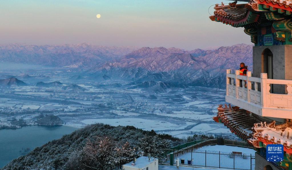 2022年3月19日,站在瞭望塔上的宋臣開始了一天的工作(無人機照片)。宋臣是北京市十三陵林場管理處駐守蟒山瞭望塔的護林員。他的職責是守護在瞭望塔上,看護著周圍1.3萬余畝范圍內國家級重點公益林。