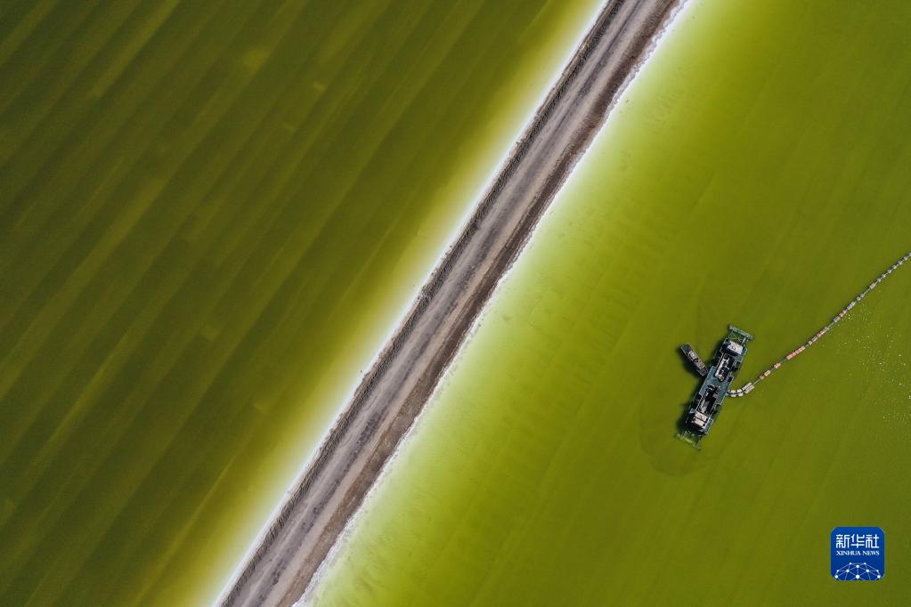 2022年4月1日,采鹽船在青海鹽湖工業股份有限公司鉀肥分公司的鹽湖工作(無人機照片)。每年3月至4月是春耕備耕關鍵期,青海鹽湖工業股份有限公司鉀肥分公司的各條生產線滿負荷生產,助力春耕備耕。