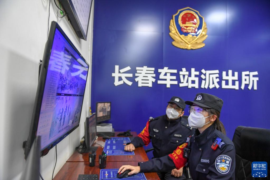 1月9日,在長春鐵路公安處長春車站派出所,朱榮超(右)與同事察看監控畫面。