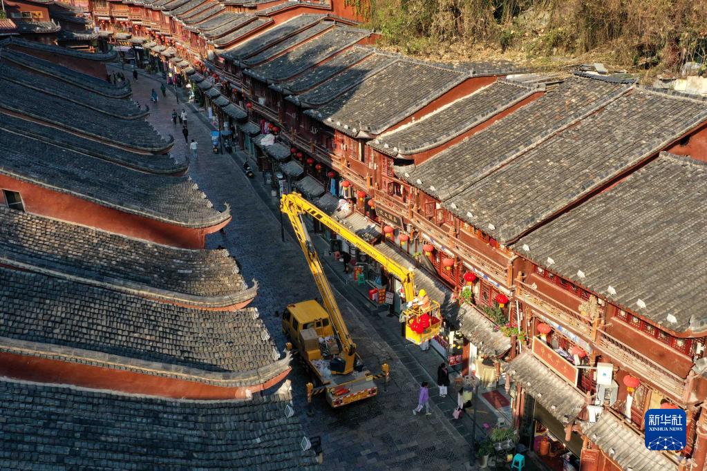 1月9日,工人在貴州省都勻市石板街懸掛紅燈籠(無人機照片)。