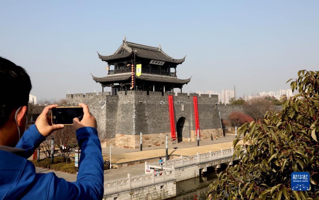 1月9日,一名市民在拍攝蘇州婁門古城門城墻上的巨幅春聯。新華社發(杭興微 攝)