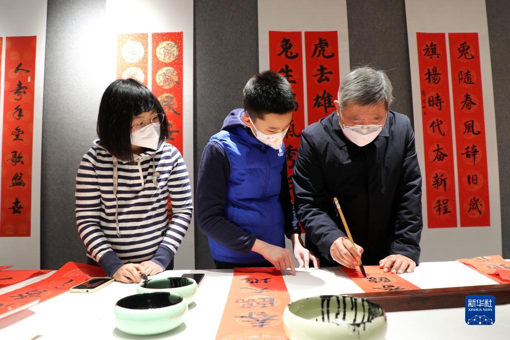 1月9日,在石家莊市劉金凱書法家工作室,書法家劉金凱(右)指導書法小學員寫春聯。