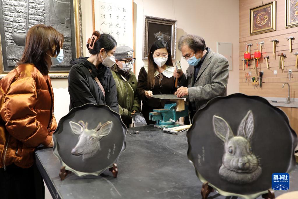 1月9日,在石家莊市灣里廟步行街郭海博民間文藝家工作室,鐵板浮雕藝術家郭海博(右一)在向觀眾介紹鐵板浮雕技藝。