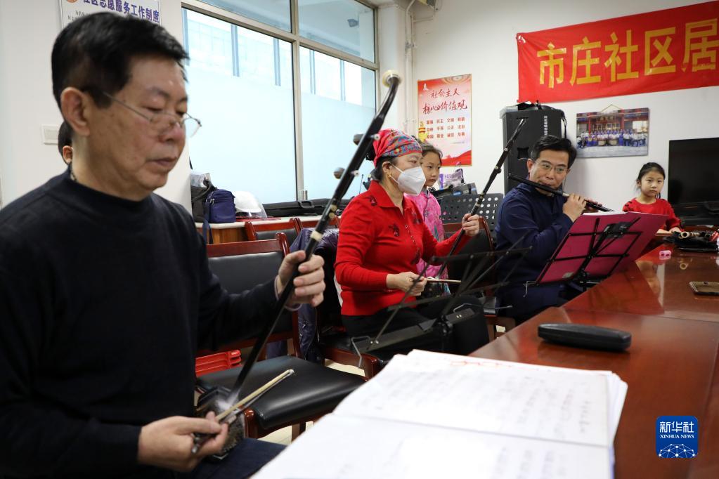 1月9日,在石家莊市市莊社區居委會群眾活動中心,音樂家張勇(右二)在指導文藝愛好者練習民樂演奏。