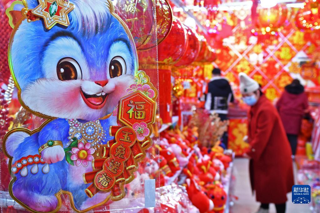 1月9日,在山東省煙臺市芝罘區三站節慶用品市場,居民在選購春節飾品。新華社發(孫文潭 攝)