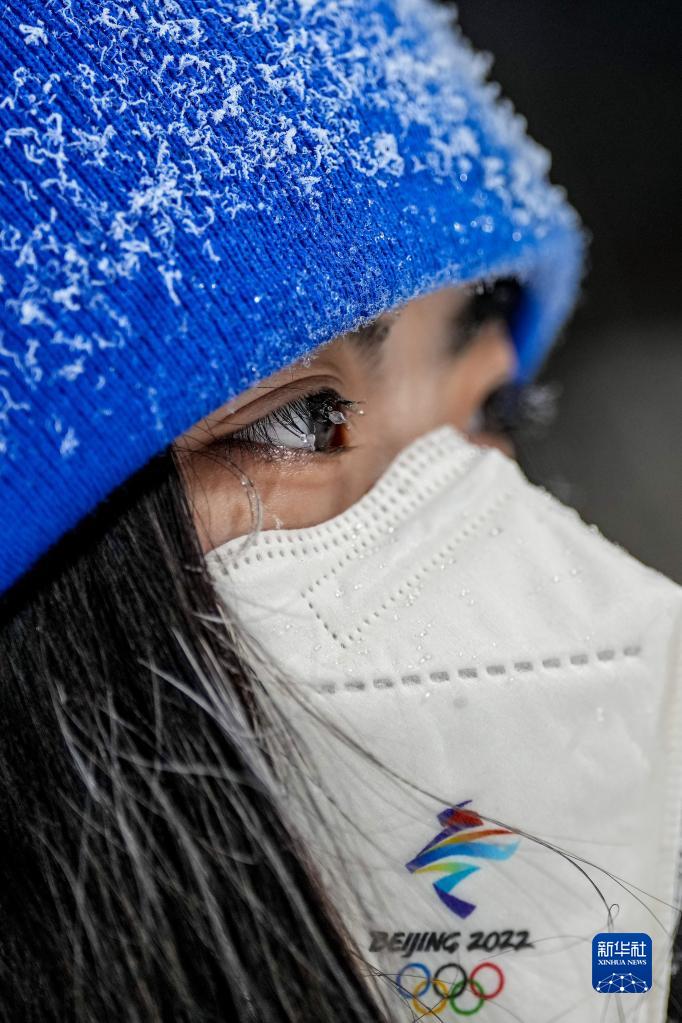 2022年2月9日晚,在國家越野滑雪中心,一位冬奧會志愿者的睫毛上結出冰珠。