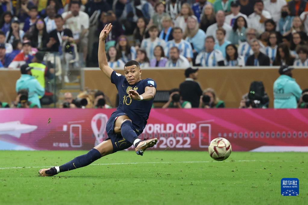 2022年12月18日,法國隊球員姆巴佩在比賽中射門得分。