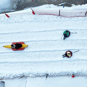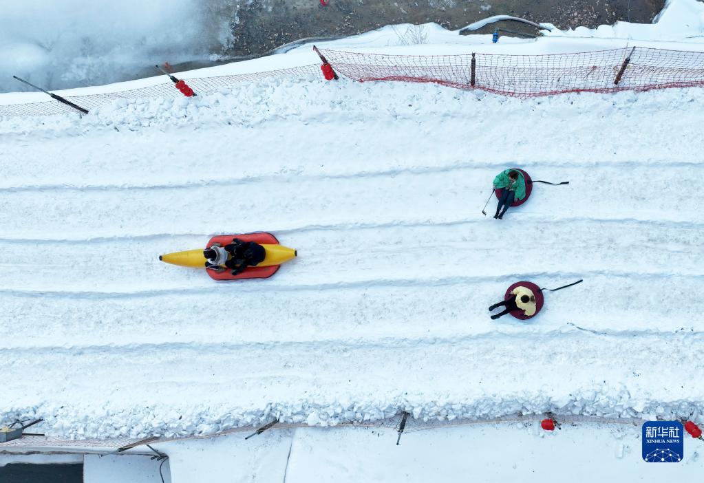 1月9日,游客在邢臺天河山景區冰雪樂園游玩(無人機照片)。