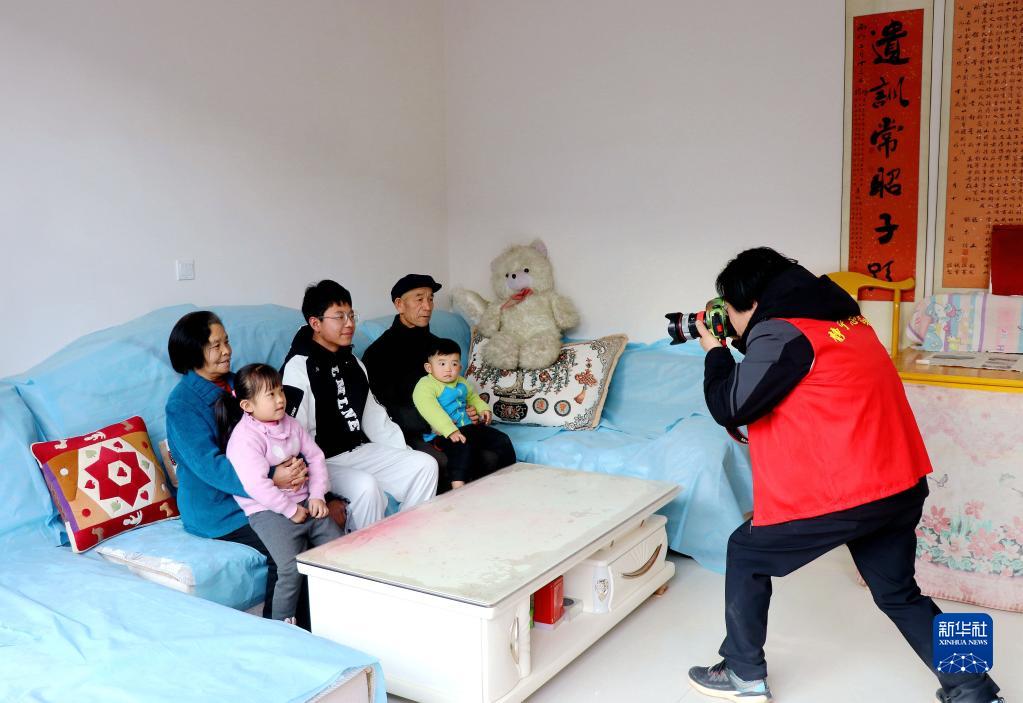 1月9日,在甘肅省平涼市靜寧縣威戎鎮楊灣村,一名志愿者在給村民拍攝全家福。