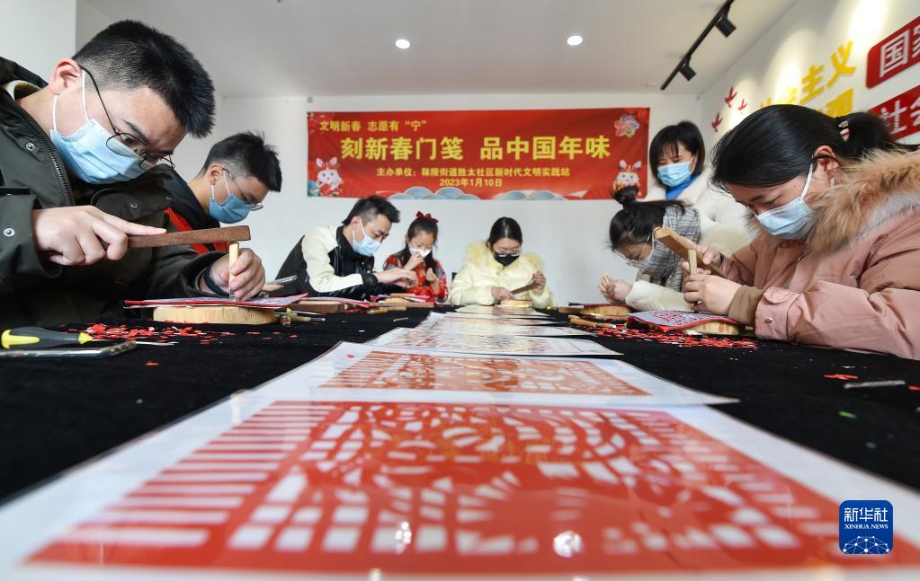 1月10日,南京市江寧區秣陵街道勝太社區,居民在刻制兔年門箋。門箋是傳統的春節門楣吉祥飾物。