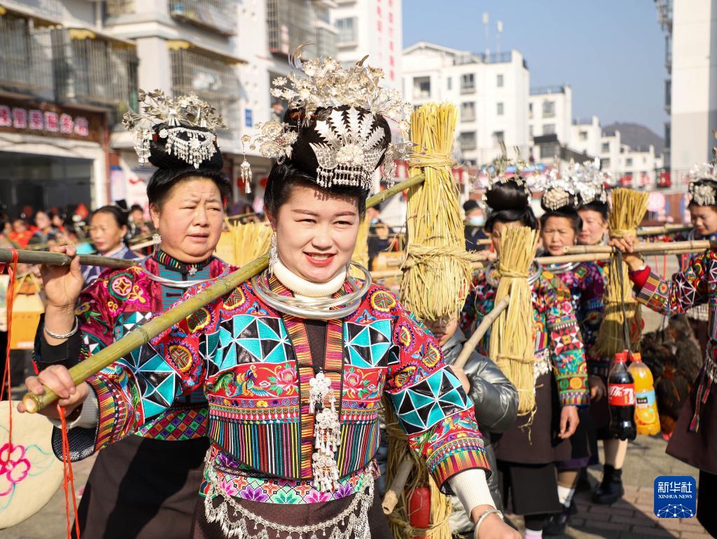 1月9日,在貴州省丹寨縣金泉街道移民安置社區,身著節日盛裝的苗族群眾參加民俗展示巡游活動。